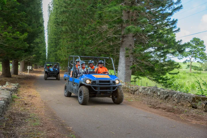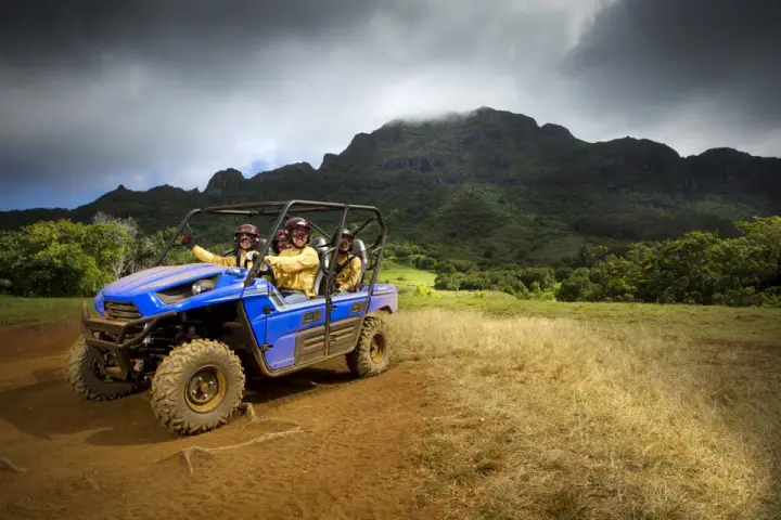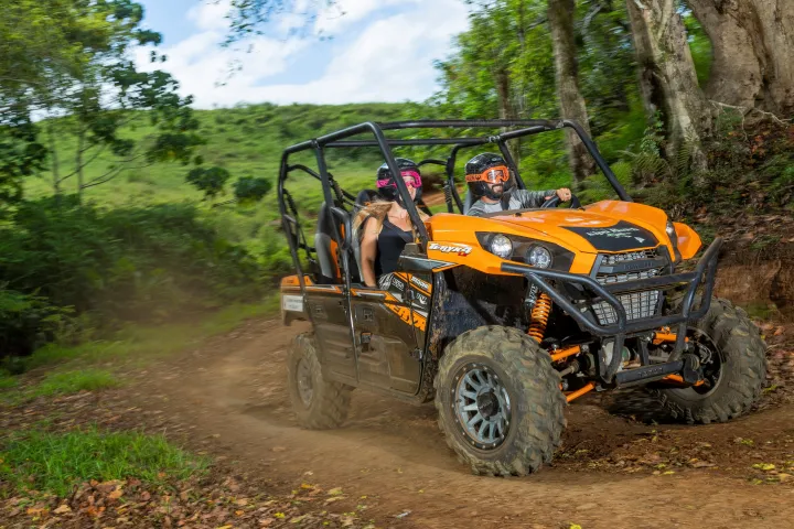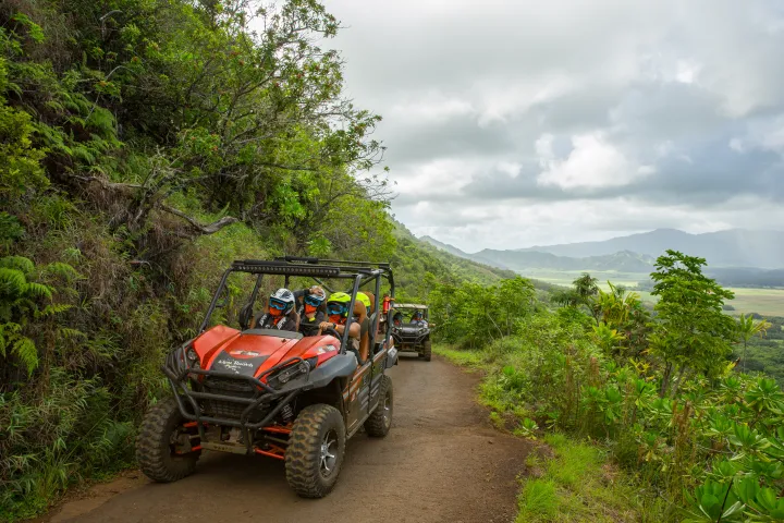 This off-road adventure tour rides through lush green pastures, ventures down into tropical Huleia Valley, and ascends from under the canopy of the rainforest, as it leads you to the breathtaking backdrop of Mt. Haupu, Kauai’s untouched paradise.